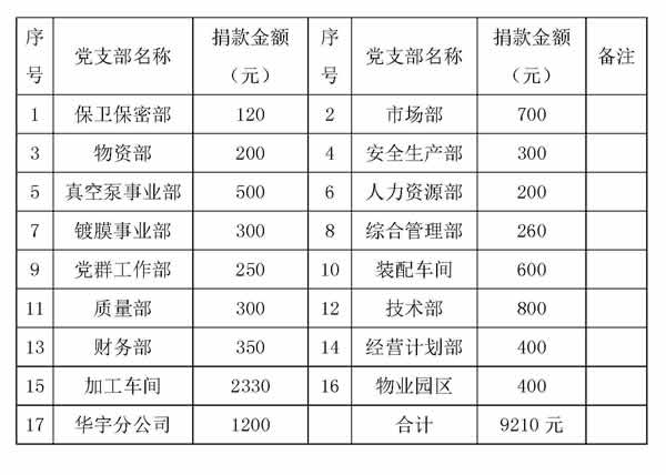公司17個黨支部共捐款合計9210元(玖仟貳佰壹拾元整),黨群工作部已將全部捐款上繳。各支部捐款明細如下: